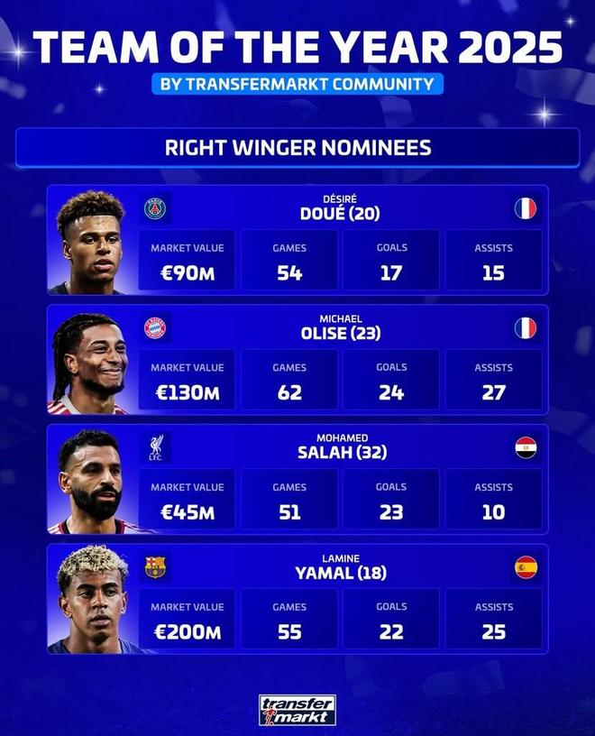 北京时间12月5日,正在评选2025年度最佳阵容的德转列出了最佳右边锋的四名候选者,巴黎圣日耳曼的杜埃、拜仁慕尼黑的奥利塞、利物浦的萨拉赫以及巴塞罗那的亚马尔上榜。